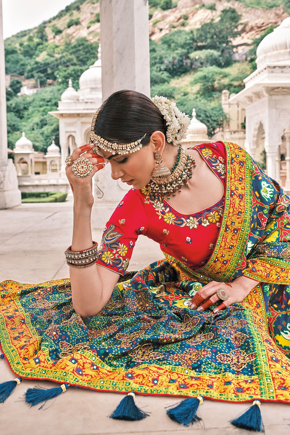 Blue Patola silk saree with heavy aanchal Yellow border and printed blouse