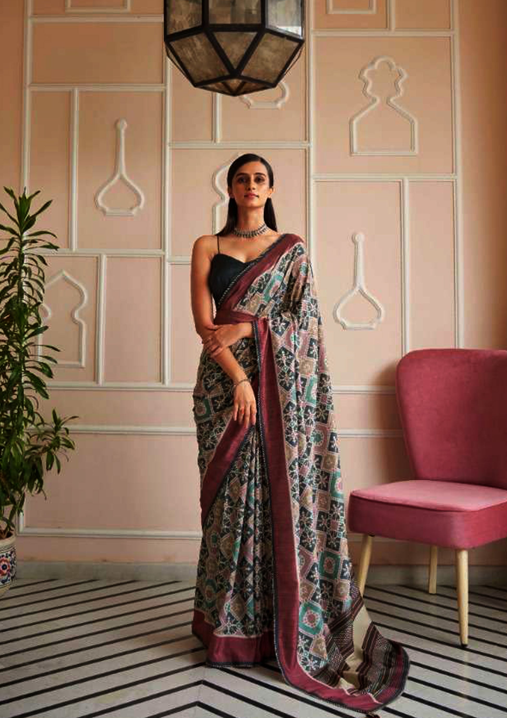 Multicolor printed pure silk saree with pink border and black colored blouse | Perfect for this festive season