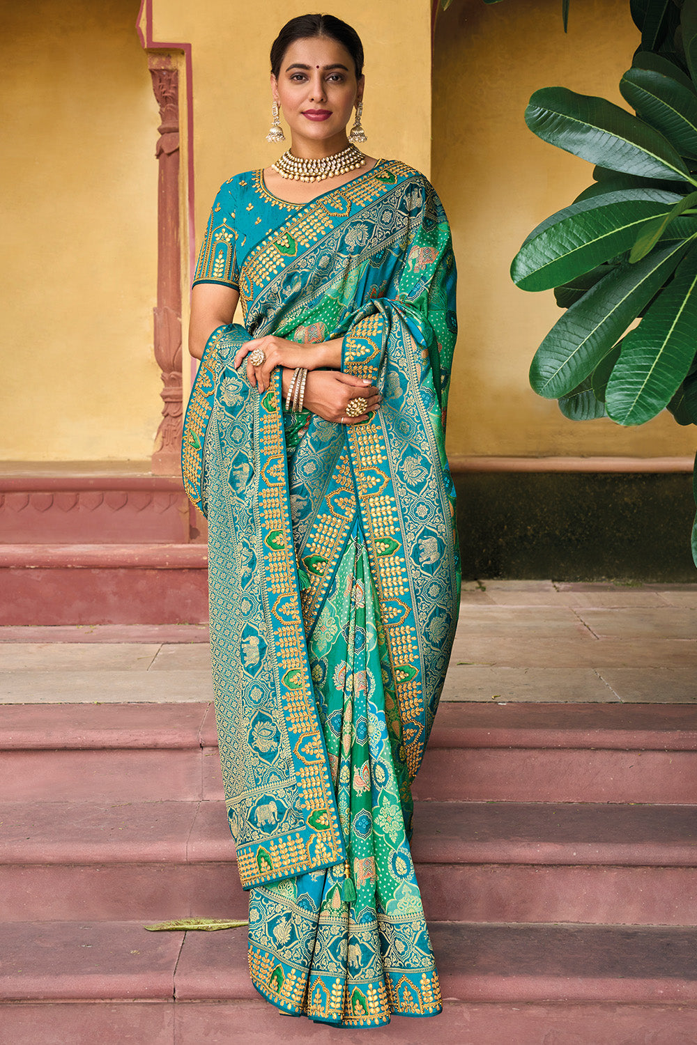 Teal Green pure silk saree with heavy aanchal golden border and printed blouse